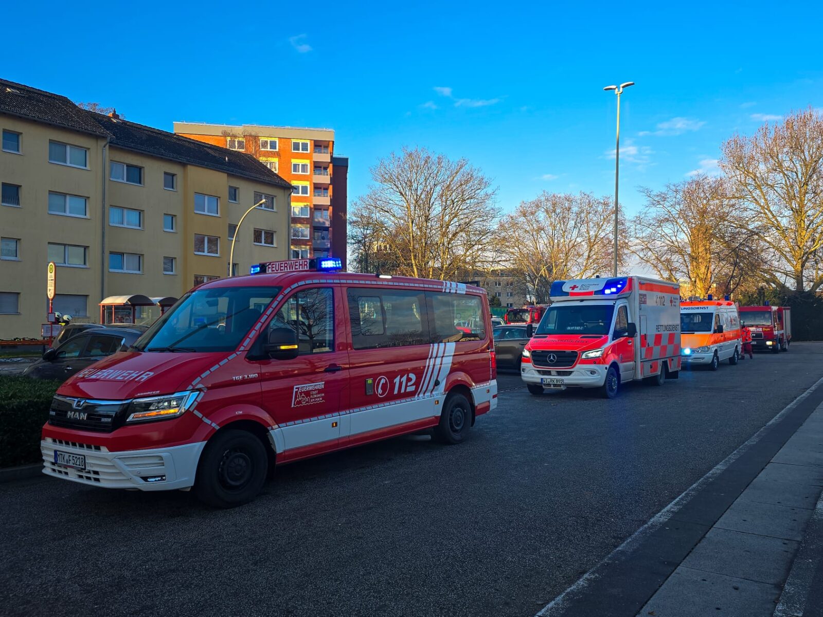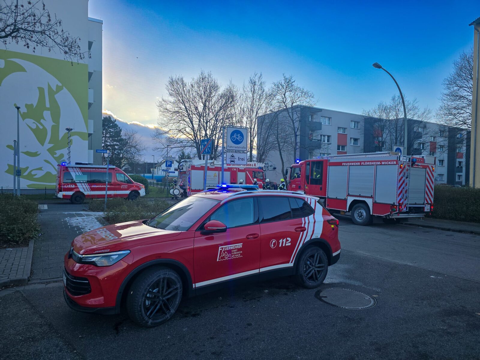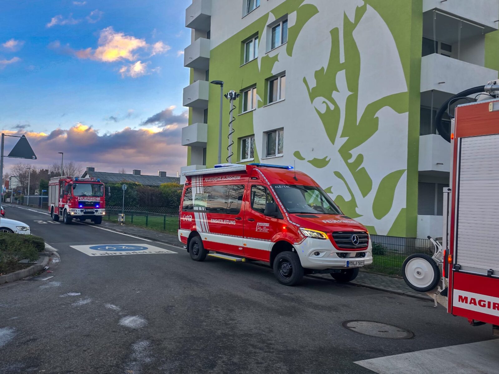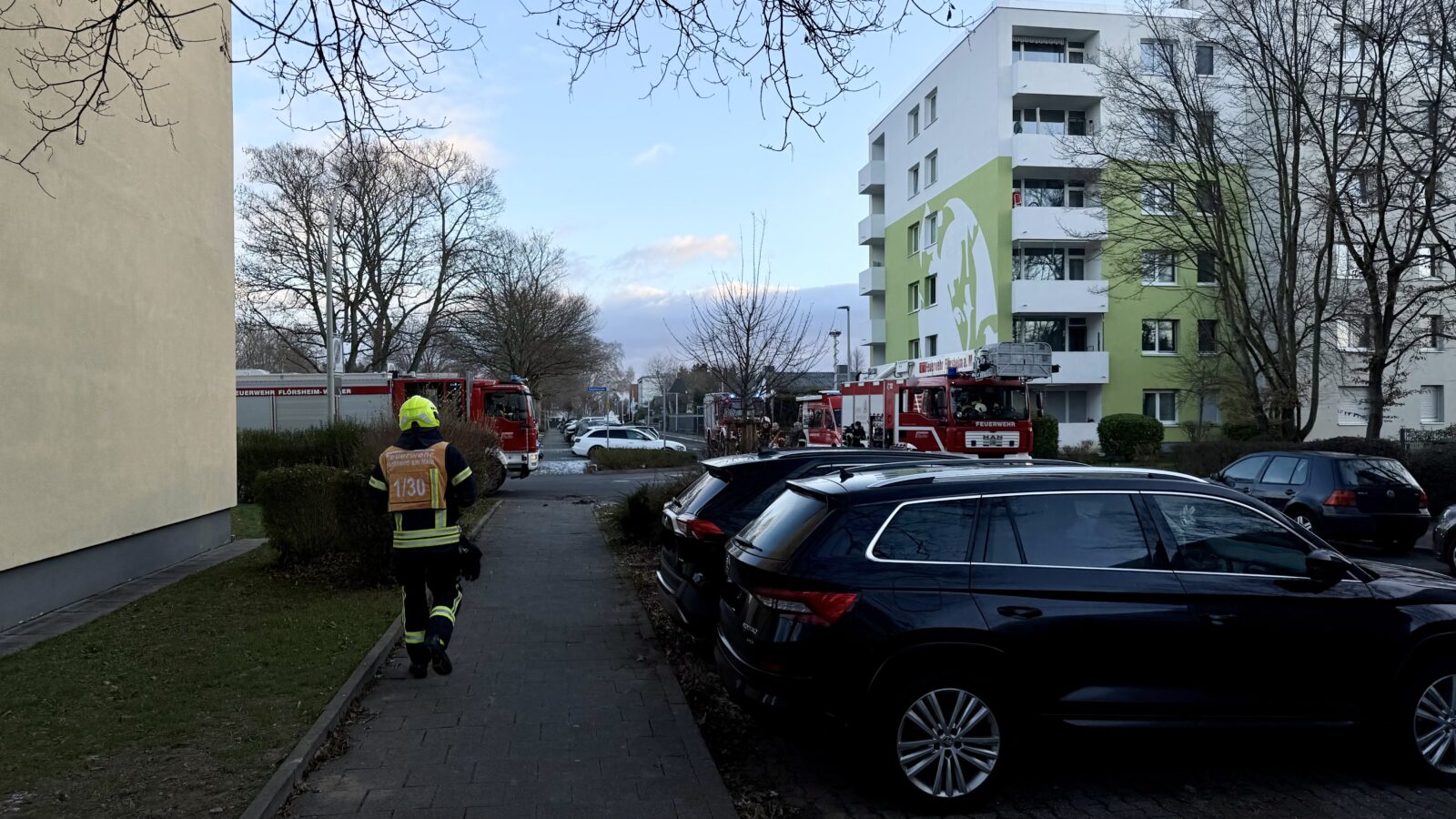 Die Feuerwehren der Stadt Flörsheim am Main, die Drehleiter der Feuerwehr Hochheim am Main, der Regelrettungsdienst, das DRK Flörsheim sowie die Polizei wurden am Samstagmorgen zu einem Brand in einem mehrgeschossigen Mehrfamilienhaus nach Flörsheim alarmiert. Bei der Einsatz-Meldung „Brand in Gebäude – Menschen in Gefahr“ werden nach Alarmplan alle drei Feuerwehren und Unterstützungseinheiten alarmiert, so auch der Brandschutzaufsichtsdienst, der in Person des Stellv. Kreisbrandinspektors ebenfalls vor Ort war.